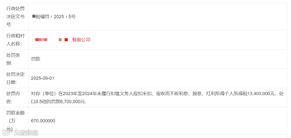 处罚内容:对你(单位)在2023年至2024年未履行扣缴义务人应扣未扣、应收而不收利息、股息、红利所得个人所得税13,400,000元,处以0.5倍的罚款6,700,000元。