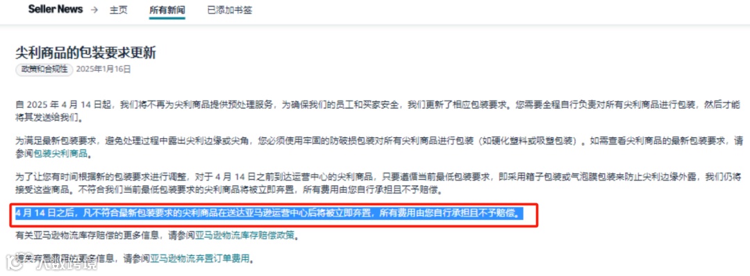 自2025年4月14日起,亚马逊要求卖家对尖锐商品采用更严格的包装标准,以保障员工与客户安全。以下是新规重点: