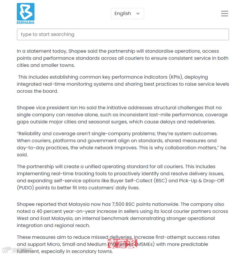 根据Shopee介绍,合作框架将推动各快递公司采用统一的运营标准,包括使用实时追踪工具主动识别配送问题,并扩展如买家自取(BSC)与自助寄取(PUDO)等自助服务网点。这些措施预计将减少投递失败率、提升首次派送成功率,并为中小微企业(MSME)提供更可预测的履约支持,特别是在二线及偏远地区。目前,马来西亚全国已有7500个BSC服务点。数据显示,使用本地物流合作伙伴的卖家数量在马来西亚东部和西部地区均同比增长40%,反映出区域覆盖与网络协作正持续改善。