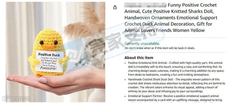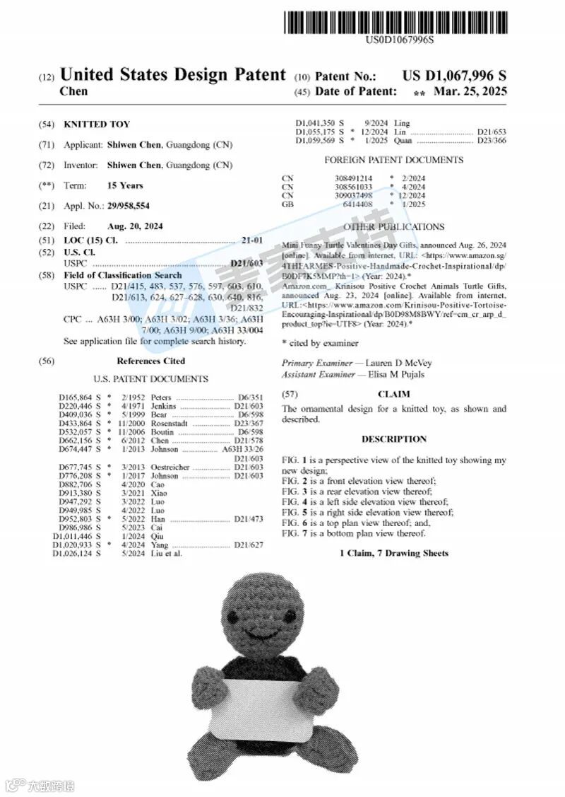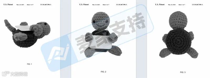 11月23日,Aptum律所代理国人卖家Shiwen Chen在宾夕法尼亚州连发两起专利维权案件,均处于密封状态,但麦家支持通过排查发现,该原告于2025年在美国共下证了两个外观专利,均与针织玩偶相关,分别是3月25日下证的D1067996,以及7月8日的D1082962专利。跨境卖家需针对针织玩偶产品进行排查,避免侵权导致的TRO冻结风险!