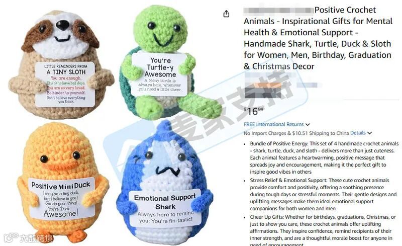 Shiwen Chen是一名来自中国深圳的国人卖家,专注于针织玩偶的产品研发与设计,创作的无论是钩针小海龟,还是钩针小黄鸭,都手持励志卡片,为用户装饰空间的同时可以带去笑容和慰藉。Shiwen Chen针织玩偶是自用装饰家居环境,或者办公桌,或者送人的不二选择,在平凡的生活给人以力量和鼓励!