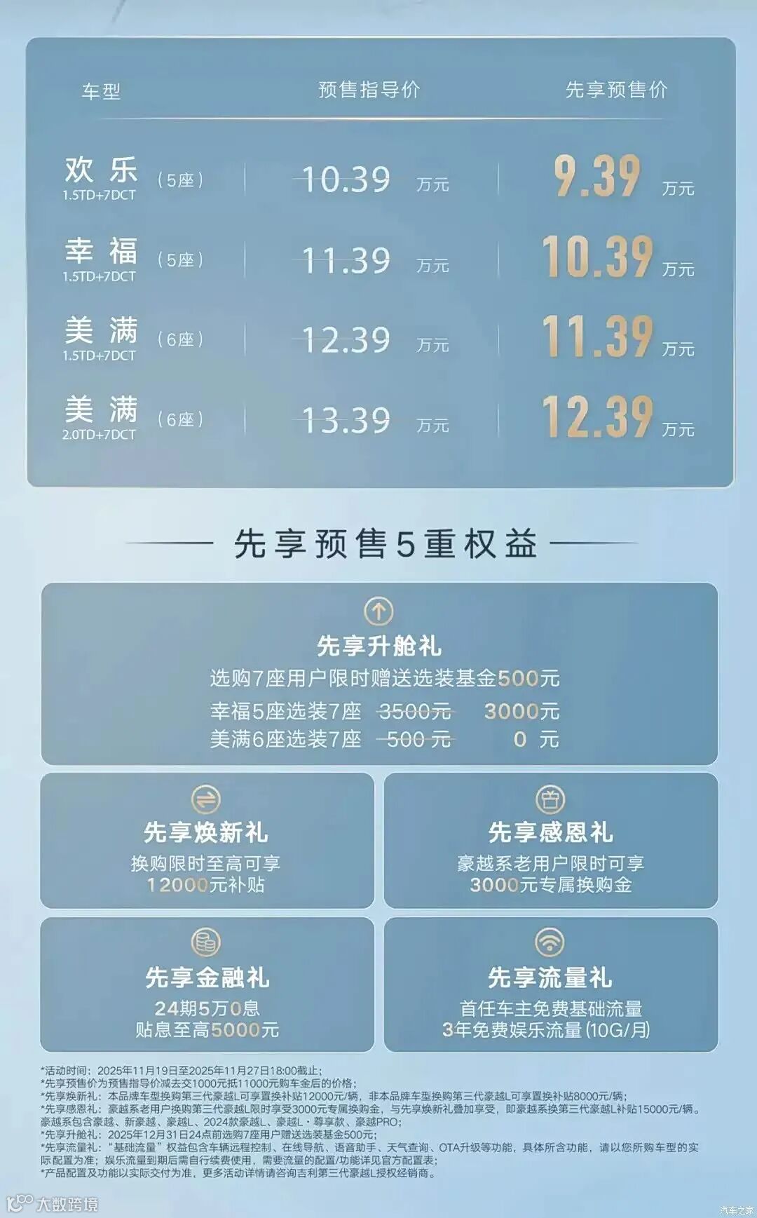 还没等到正式上市,新款豪越L的预售策略就已经在车圈引起了不小的波澜。官方确认新车将于11月27日正式发售,这次改款最大的看点莫过于价格下探——先享预售价直接杀到了9.39万元起,即便顶配也不过12.39万元。