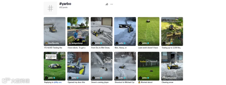 在以趣味性和视觉冲击为核心的TikTok上,Yarbo没有单纯列出产品参数,而是将扫雪机器人直接融入北美家庭的真实生活场景。无论是吹落叶、快速割草,还是扫雪清理不同地形,它都通过操作演示和功能展示,让用户直观感受产品优势。