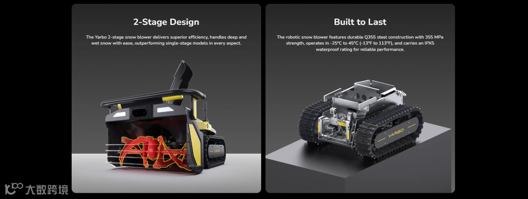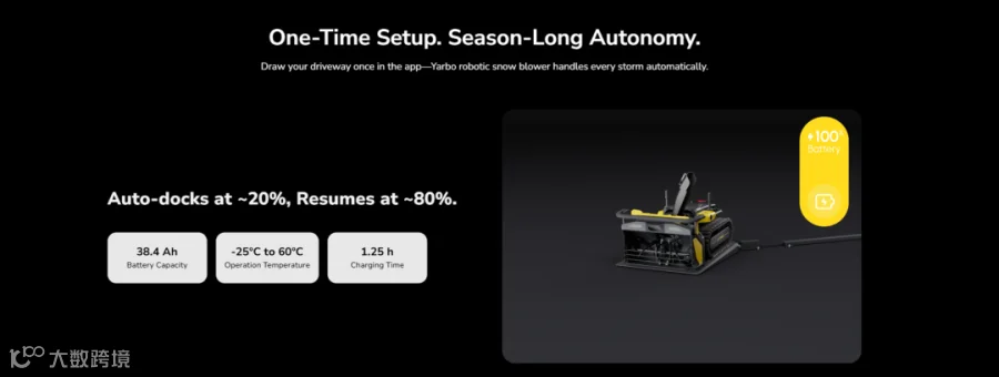 为了解决低温这个“致命点”,Yarbo和上游供应链、科研机构一起联合研发了一套可自加热的耐低温电池系统。同时针对严寒环境,还特别设计了能在零下数十度仍保持强劲启动、稳定输出的电机,并把原本昂贵的能源系统成本控制到了可落地的商业区间。