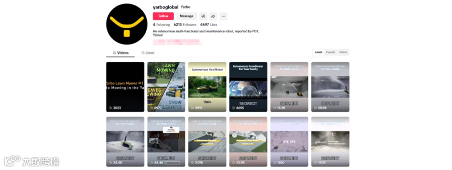 因此Yarbo在TikTok、YouTube、Instagram等主流海外社媒均有布局,并且它没有把鸡蛋放在一个篮子里,而是根据不同海外社媒的特点和用户习惯,灵活讲述同一个品牌故事,让更多人看到、理解并产生共鸣。