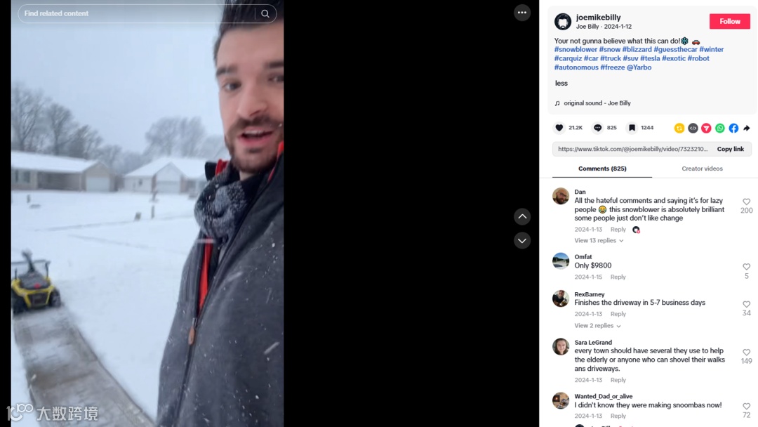 例如TikTok博主@joemikebilly的一段真实分享,他在视频中通过生活化、趣味性的开场“新车?其实是扫雪机器人”,瞬间抓住观众注意力。