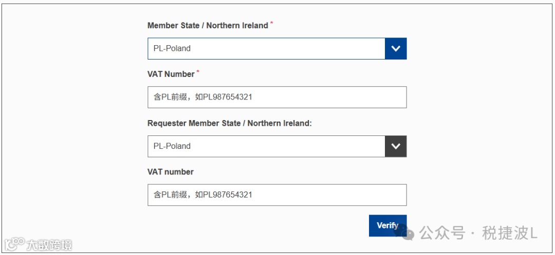 • 明确交易主体:明确税号所属企业的名称、地址及所属成员国(如波兰企业的税号会显示“Poland”);