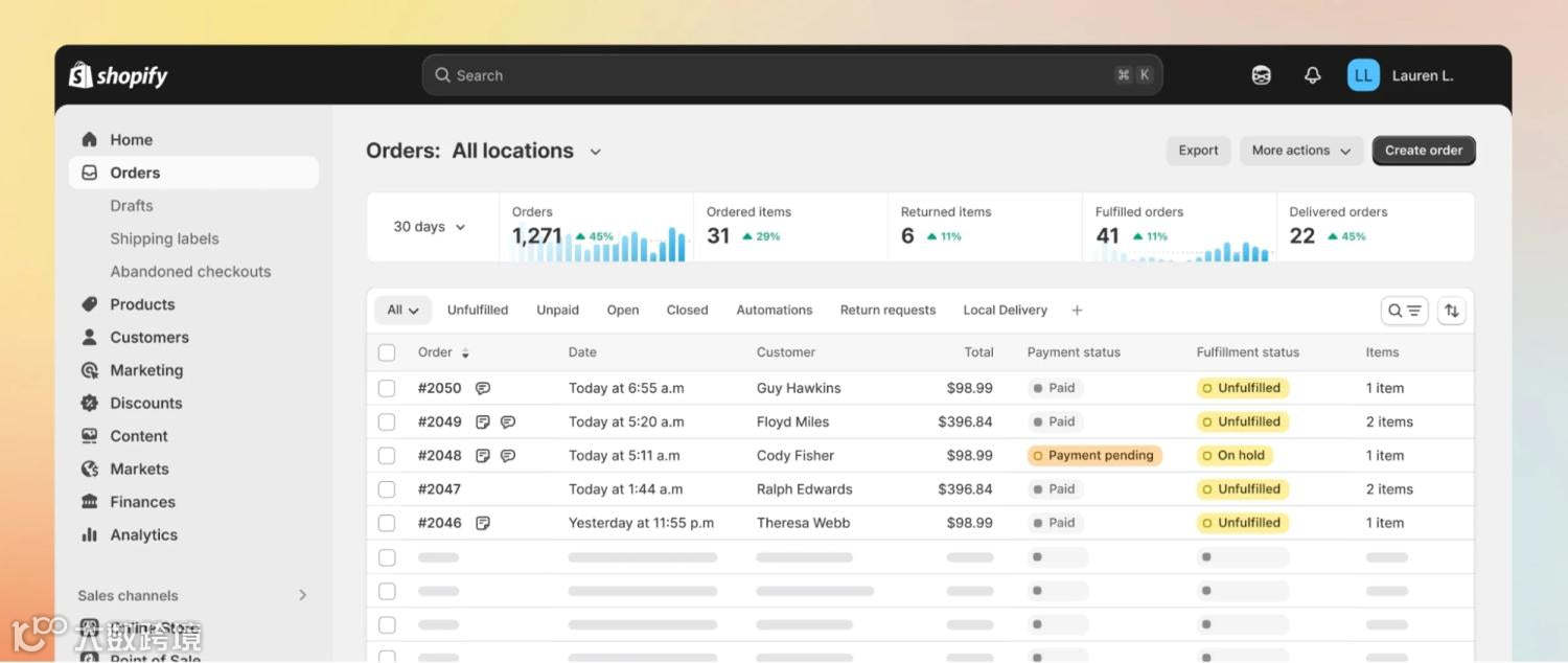 Shopify的订单标签页为你提供一个集中的仪表板,管理来自每个销售渠道的订单——无论是来自你的在线商店、Facebook Shop还是零售店面。所有订单汇集在一个地方,让自主履约管理变得更容易。