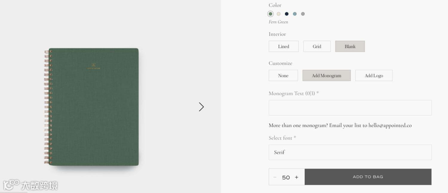 Appointed销售简洁极简的规划本、笔记本、日记、日历和文具——客户可以根据需要进行多少定制。当客户从Appointed的标准系列购买时,他们可以使用产品定制器在几种书布(装帧面料)封面颜色之间选择,并选择衬线或无衬线字体的字母组合。