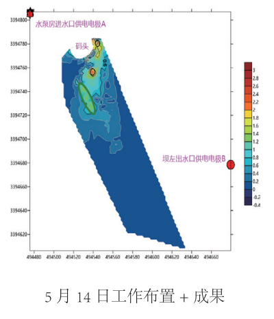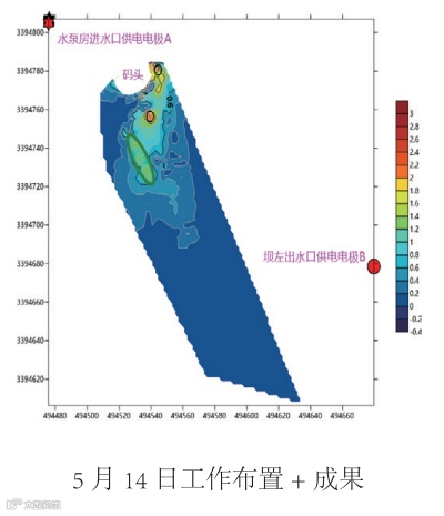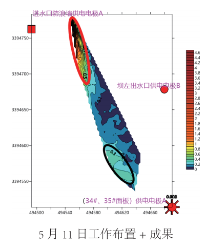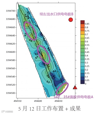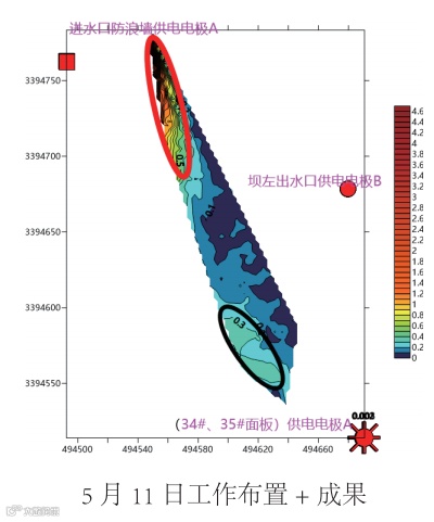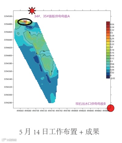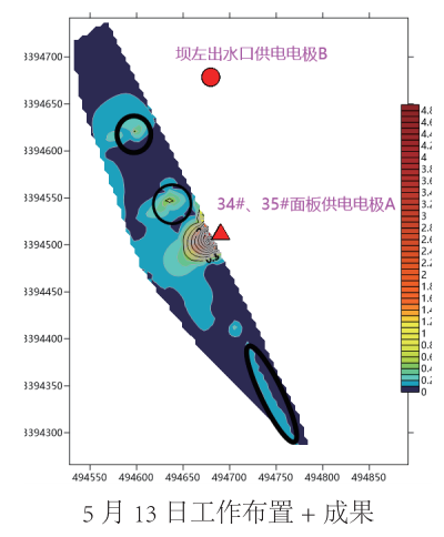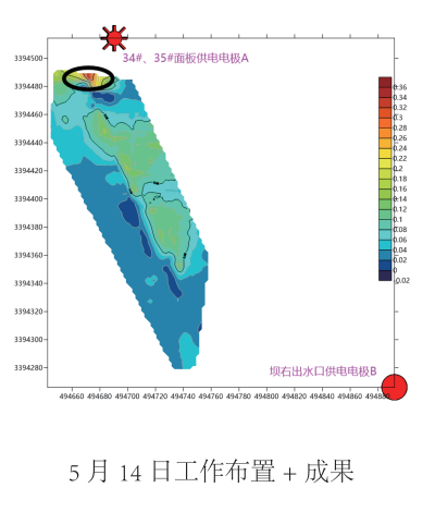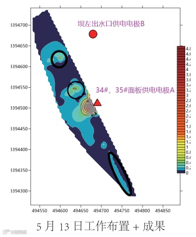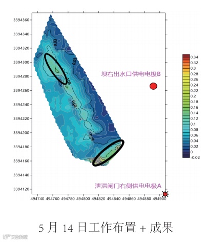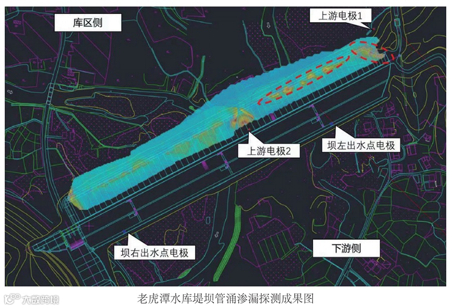 本次探测查明老虎潭水库部分区域存在疑似渗漏入口,结合水库情况综合分析以上探测结果绘制《老虎潭水 库堤坝管涌渗漏探测成果图》,得到以下认识: