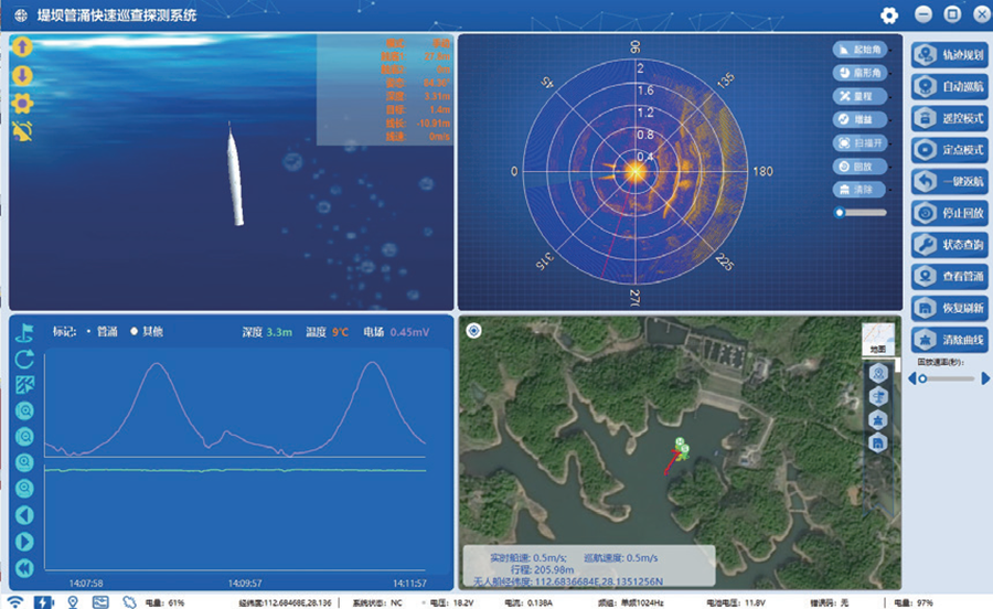 DB-5堤防隐患无人巡查系统是依据“拟流场法”基本原理研发制造的新型智能化系统。集电场采集、深度探测、温度测量、声呐扫描等功能于一体,快速、精准探测江河湖库的堤防隐患入水口,广泛应用于土坝、石坝或混凝土坝等各种坝体和坝基的渗流渗漏探测。