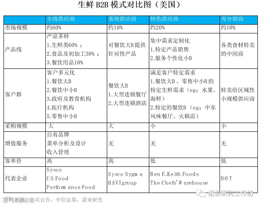 美国生鲜B2B市场主要分为四类模式:全线供应商(占比约60%)、系统供应商(约10%)、特色供应商(约20%)、再分销商(约10%)[k]。