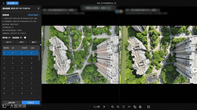 智能检测两期媒体(俯拍视角)或二维正射图的变化区域,并自动生成报告,统计变化区域信息。