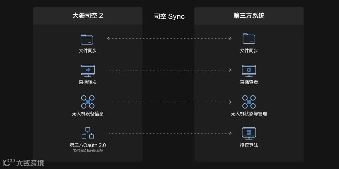 司空 Sync 支持大疆司空 2 与业务云平台的无代码对接。用户通过可视化界面的简易配置,即可轻松同步媒体文件、直播码流等数据,实现系统间高效集成与数据互通。