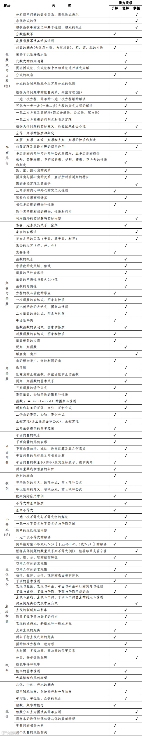 全卷中了解、理解和掌握三个能力层级试题所占比例依次控制在 20%、60%和20%左右。具体各知识点的能力层级要求如下表: