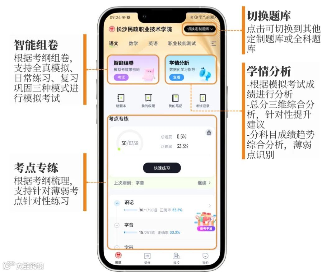 -定制题库:针对“考纲差异大”的痛点,直接对标各校考点——比如长沙民政的技术类题目、长沙航空的综合素养题,刷题不用再乱找资料