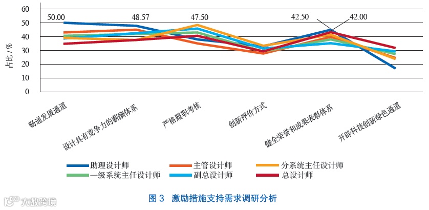 激励措施是指组织设计适当的奖酬形式和工作环境,以及一定的行为规范和奖惩措施等,强调组织对设计师薪酬体系、考核评价方式和职业发展通道等方面的支持(图3)。各级设计师在激励措施方面高度关注“畅通发展通道”,尤其是助理设计师更为突出,占比50.00%;48.57%的助理设计师和44.8%的主管设计师群体希望“设计具有竞争力的薪酬体系”;分系统主任设计师和副总设计师对“严格履职考核”需求更强烈,分别占比47.50%、44.1%;助理设计师和总设计师对“健全荣誉和成果表彰体系”呼声更高。可见设计师成长过程中,职业发展通道对所有设计师群体均十分重要,尤其对于初期阶段的设计师群体,需要组织一开始就明晰主线方向;一线员工更关注薪酬待遇等物质激励,但与此同时,精神激励也不可少。