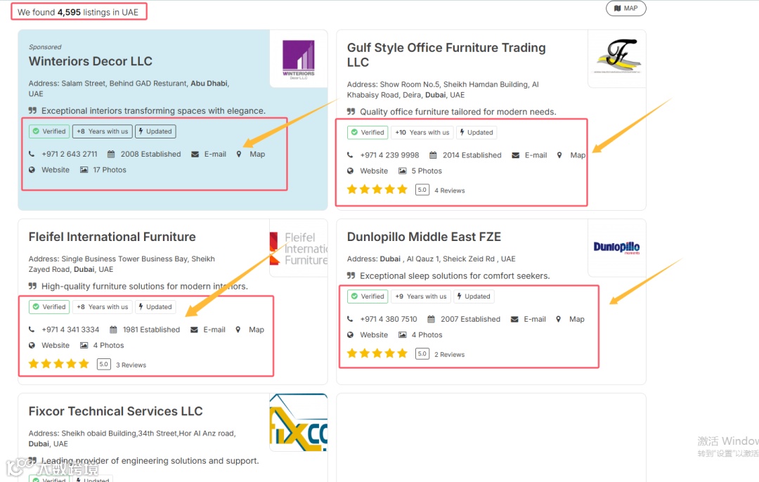 我选了furniture这个目录,没想到就有4500家阿联酋的企业,而且我发现电话,网站,公司名,地址什么的都有了。