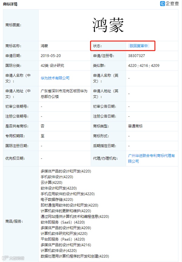 据企查查信息,华为于2019年申请注册第42类“鸿蒙”文字商标,2020年流程状态变更为“驳回复审”[k]。