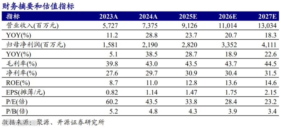 公司发布2025年三季度报告。(1)前三季度,公司实现营收65.08亿元,同比+20.96%;归母净利润19.59亿元,同比+22.16%;扣非归母净利润17.06亿元,同比+18.74%;销售毛利率42.49%,同比-0.28pcts;销售净利率30.08%,同比+0.28pcts。(2)第三季度,公司实现营收23.60亿元,同比+20.79%,环比+1.90%;归母净利润7.21亿元,同比+24.86%,环比+2.40%;扣非归母净利润6.40亿元,同比+22.23%,环比+3.60%;毛利率43.39%,同比-0.90pcts,环比+0.66pcts;净利率30.55%,同比+1.00pcts,环比+0.14pcts。(3)我们认为随着AI数据中心对SOFC需求增加,公司有望将SOFC业务打造成新的增长曲线,我们维持公司2025年盈利预测,上调2026/2027年盈利预测(归母净利润原值为32.94/38.79亿元),预计公司2025/2026/2027年归母净利润为28.20/33.52/41.11亿元,当前股价对应PE为33.8/28.4/23.2倍,维持“买入”评级。