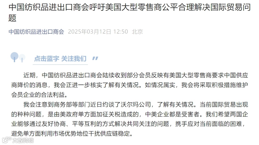 3月12日,中国纺织品进出口商会官方对此事发布声明,称当前国际贸易出现的种种问题,是由美政府单方面加征关税造成的,中美企业都是受害者。希望能够通过友好协商、平等互利的方式解决问题,避免单方面利用市场优势地位干扰供应链稳定。