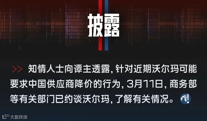 据悉,就前段时间沃尔玛要求中国供应商大幅降价事件,商务部等有关部门已于3月11日约谈沃尔玛。