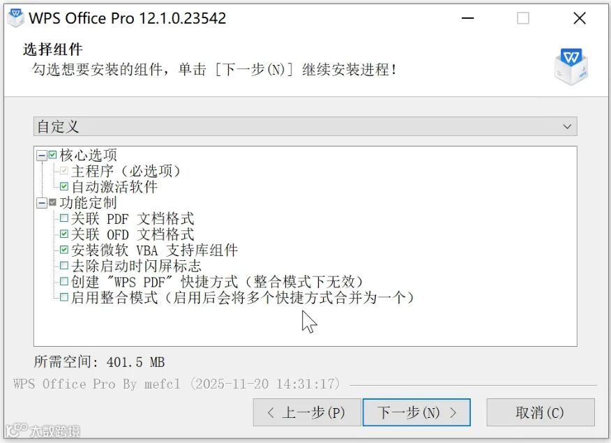 这是一款已内置永久激活的WPS2025专业版,它支持PDF文档格式、它支持安装微软VBA组件,你只需要勾选你所需要的功能,然后点击下一步,选择好软件存放路径后,即可快速安装到电脑上直接使用,非常简单方便。