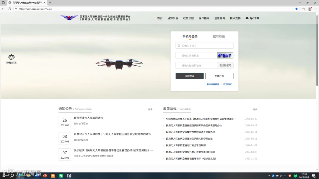 登录“民用无人驾驶航空器综合管理平台”,绑定实名登记无人机及驾驶员资质。