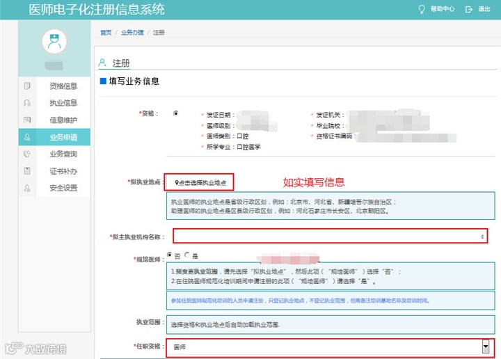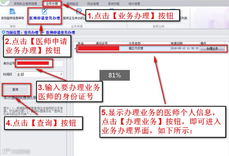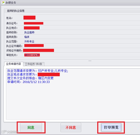 在下图中单击【医师申请业务办理】按钮,进入“医师申请业务办理”窗口。