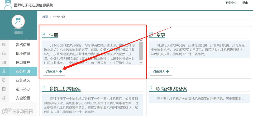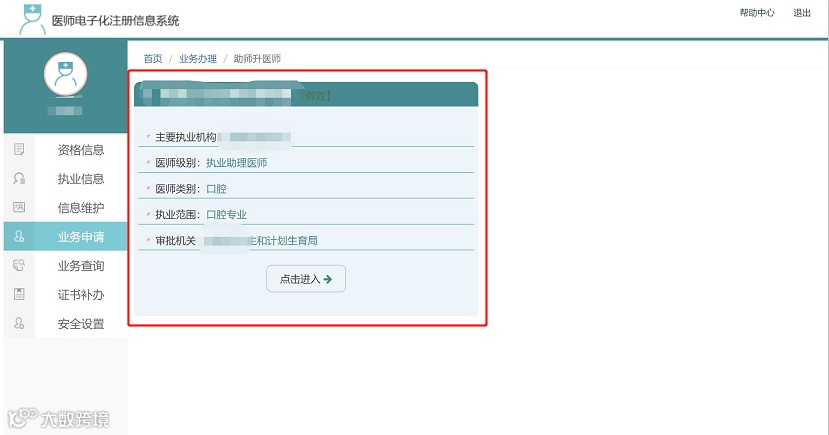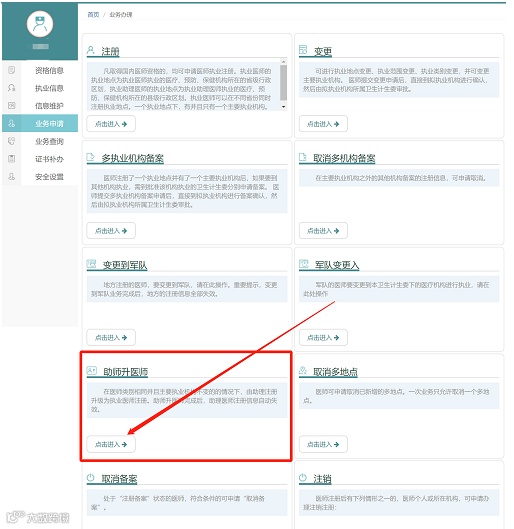 (2)助理升执业(同一个医疗机构),点击业务申请,选择助理升执业