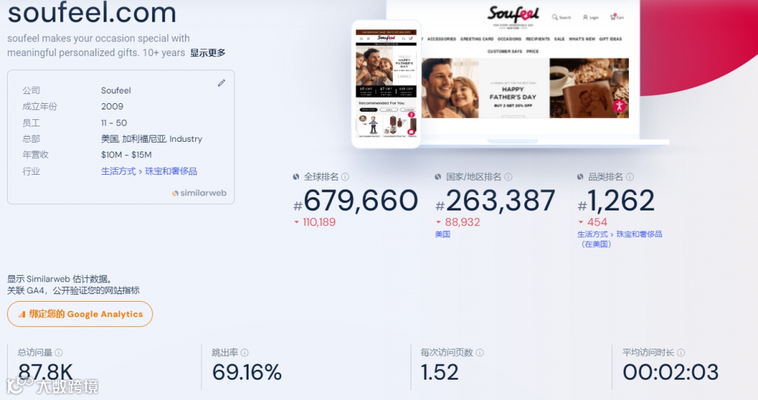 根据similarweb数据显示,Soufeel年营收在1000万美元——1500万美元之间,其10月份网站访问量达8.78万,品牌产品受众群体广泛。
