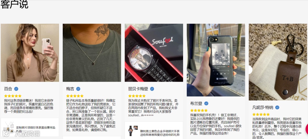 Soufeel洞察到用户消费心理,专设“Customer Says”(客户说)板块,展示消费者真实购买评价和饰品佩戴效果图。