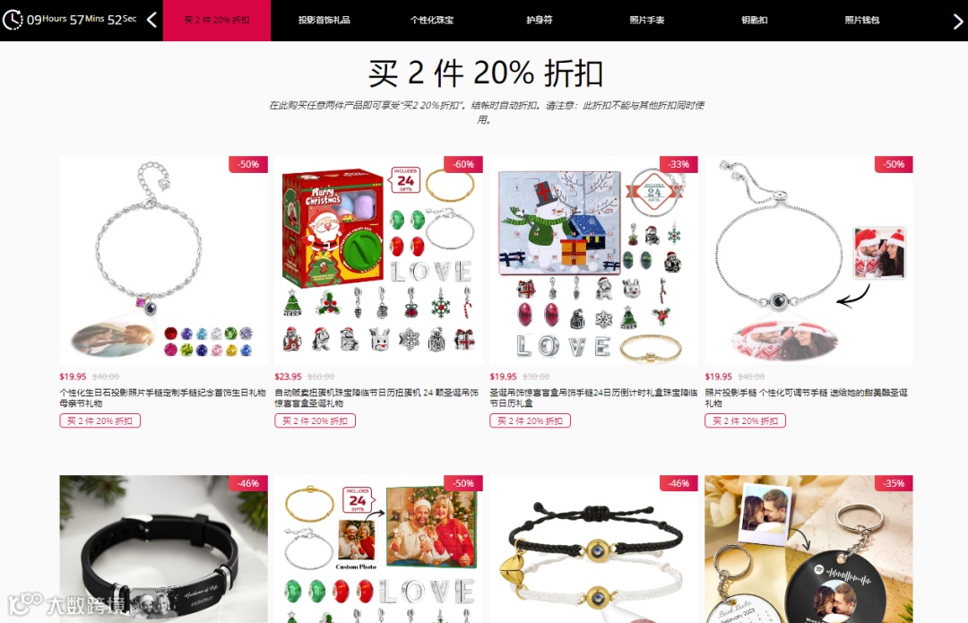 以圣诞节为例,Soufeel推出“买2件20%”的促销折扣,以动态效果展示优惠倒计时,刺激消费者购买,与Shoptop「限时促销」插件的作用相似。