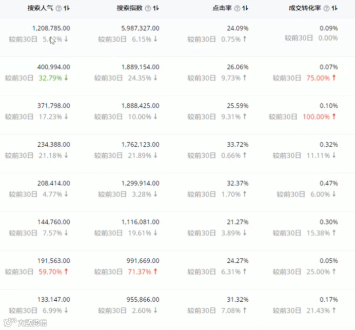 3.查看品牌搜索量的变化,搜索量上升较多以及搜索量下降较多的会标亮展示;