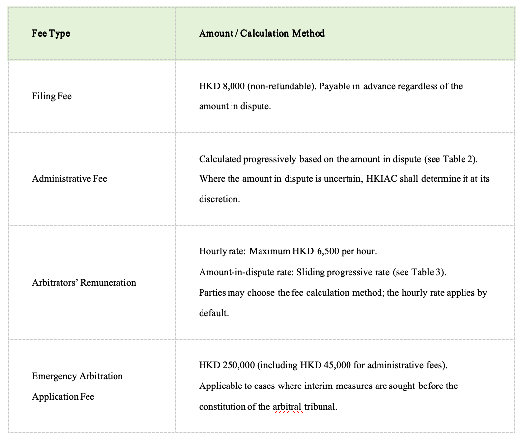 Table 1: HKIAC 2024 Administered Arbitration Fee Schedule