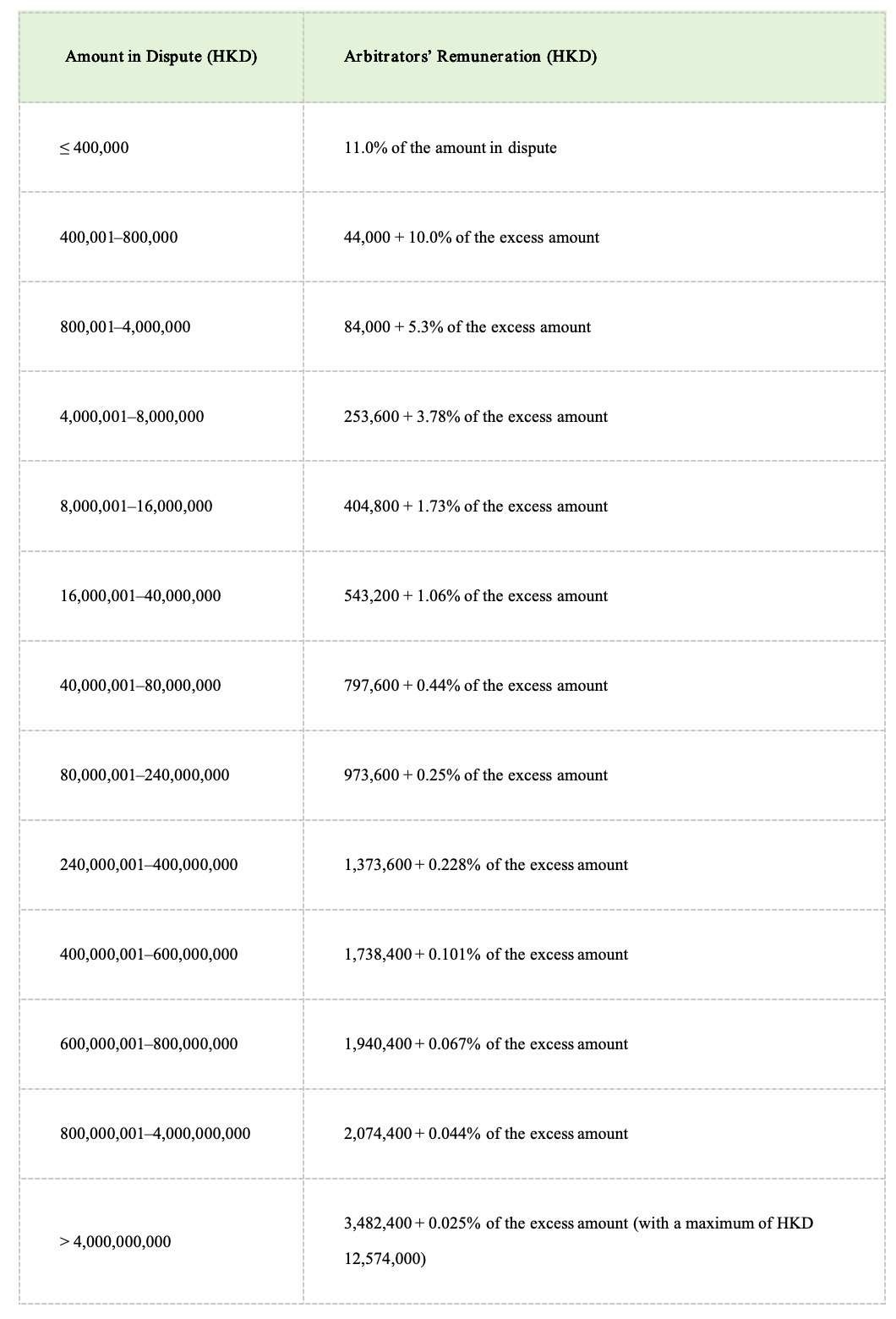 The maximum hourly rate for arbitrators under the hourly fee arrangement is HKD 6,500; for fees based on the amount in dispute, a progressive rate on a sliding scale shall apply, with specific fee scales referred to in the table below.