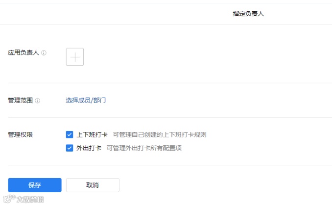 📌 注意:设置时需先明确“管理范围”(如某部门/某团队成员),后续负责人添加打卡人员、白名单等时,仅能从该范围内选择,避免误操作。