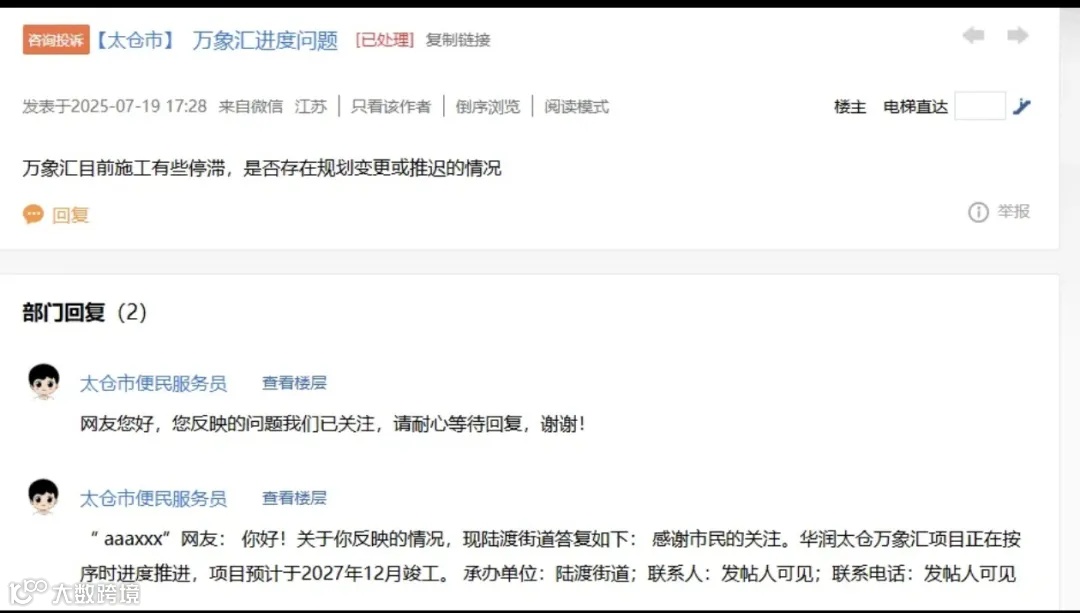 近日,有网友提问了关于娄江新城华润万象汇目前施工有些停滞,是否存在规划变更或推迟的情况。
