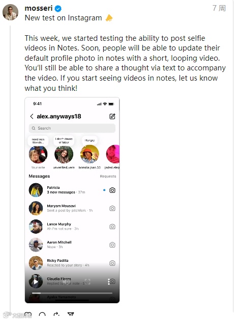 首先,有视频注释。现在,在 IG Direct 显示中创建注释时,您将能够包含一个 2 秒的循环视频,您的共同关注者或亲密朋友在其注释托盘中可以在 24 小时内看到该视频。Instagram 负责人 Adam Mosseri 早在 10 月份就首次预览了该功能: