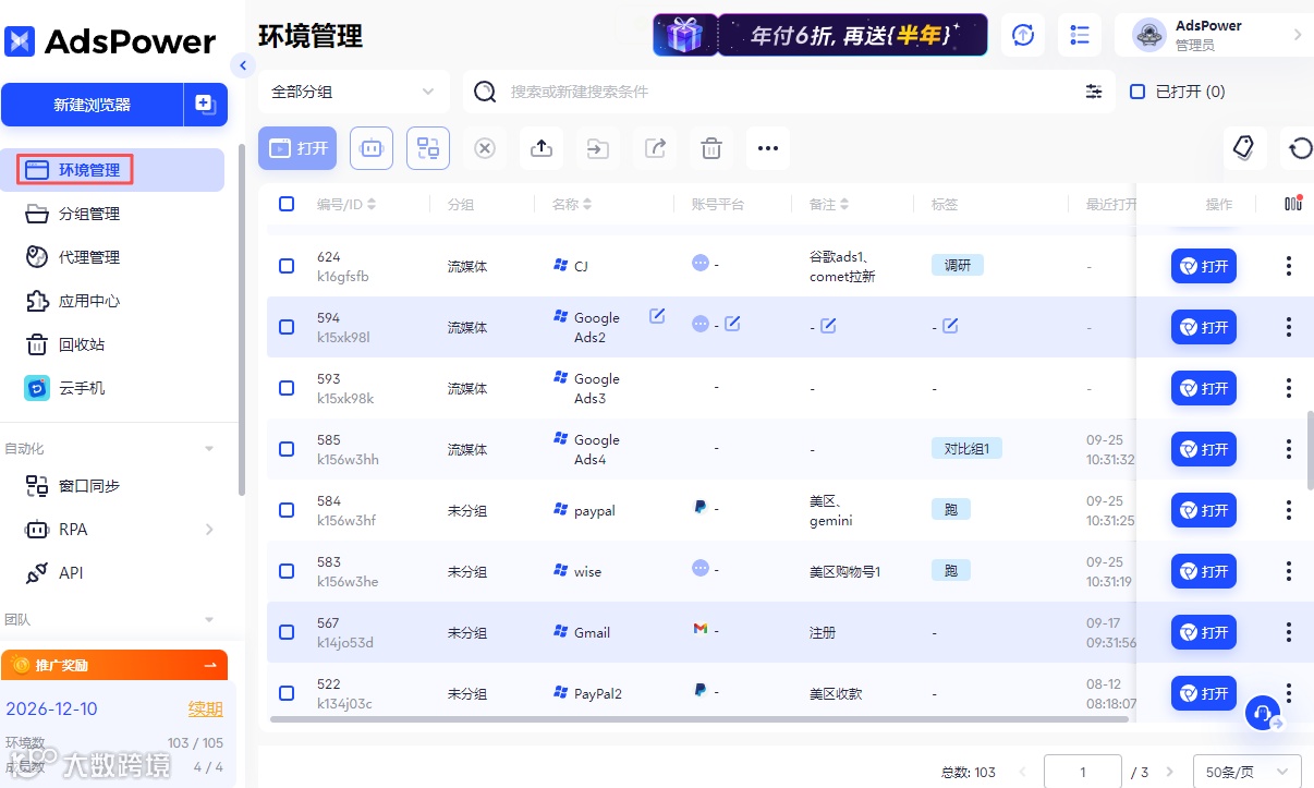 新手日预算可以设在 50-100 元这个范围,投放时间选目标国家白天,没成交的关键词及时关停。后期想加多账号增加收益,就在 AdsPower 新建环境、配对应 IP,注册新账号即可,所有账号统一界面管理,不用额外添设备,效率拉满。而且你可以轻松管理不同业务,哪怕一个账号出问题,也不会影响其他账号,安全又高效。