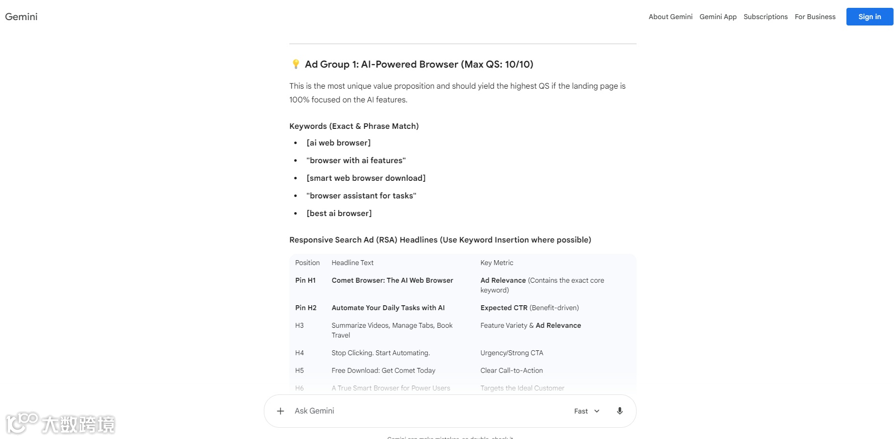 广告文案你不会自己写就打开 Gemini 输入提示词 “As a Senior Google Ads Specialist, craft ad headlines and keywords for xxx , ensuring a Quality Score of 90+”,AI 生成的内容可直接使用,既能提高广告展示量,又能降低点击成本。