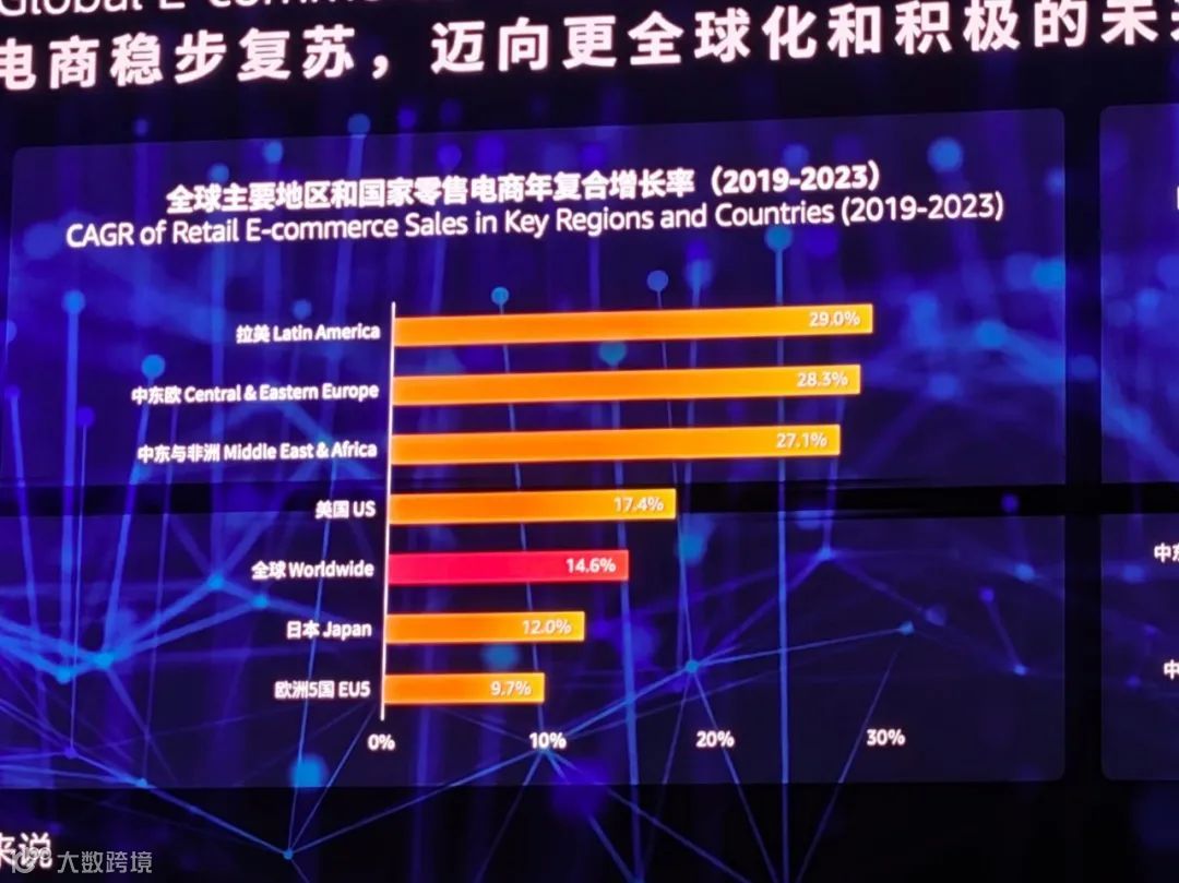 其中拉美市场拥有着不可小觑的巨大增长潜力,该地区人口高达6.58亿。根据亚马逊的相关调研数据显示,2023年全球电商渗透率达到了19.5%的水平,而拉美地区的电商渗透率仅为10.1%,仅刚好达到全球平均水平的一半,但拉美地区在线零售电商年复合增长率却高居世界第一,达到29.0%,年复合增长率和电商渗透率这两大数据进一步验证了未来几年里,该地区将保持高态的水平发展。