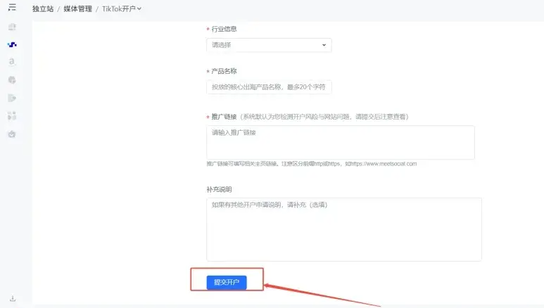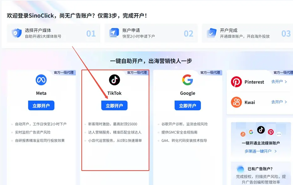 登录代理平台,选择“TikTok立即开户”,上传营业执照完成企业认证。