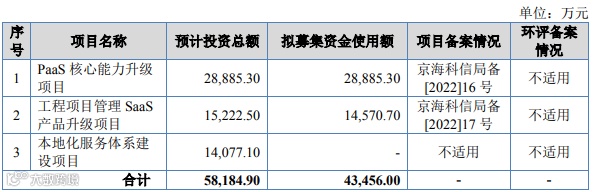 公司拟募资58,013.76万元,投向PaaS核心能力升级、工程项目管理SaaS产品升级及本地化服务体系建设三大项目。其中,PaaS项目拟投入24,899.80万元用于研发人员投入,旨在增强aPaaS、gPaaS技术能力;SaaS项目拟投入13,318.10万元,用于产品功能模块升级与结构优化;本地化服务项目拟投入12,838.00万元用于人员配置,计划在北京、上海、深圳、杭州等17个城市设立服务网点,构建全国服务网络[k]。