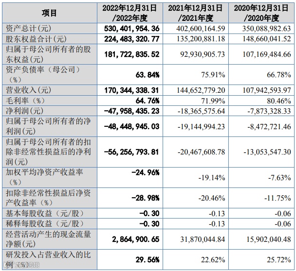 2020至2022年,公司归属于母公司股东的净利润分别为-847.27万元、-1,914.50万元、-4,844.89万元,扣非后分别为-1,305.35万元、-2,046.76万元、-5,625.68万元;截至2022年末,累计未弥补亏损达49,048.25万元[k]。