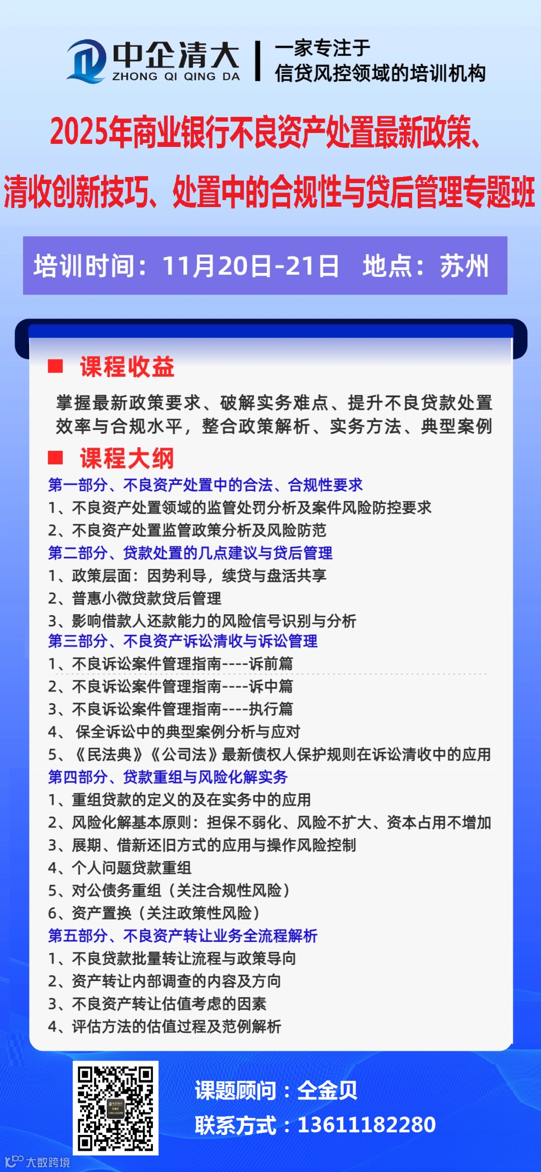 2025年商业银行不良资产处置最新政策、清收创新技巧、处置中的合规性与贷后管理专题研修班