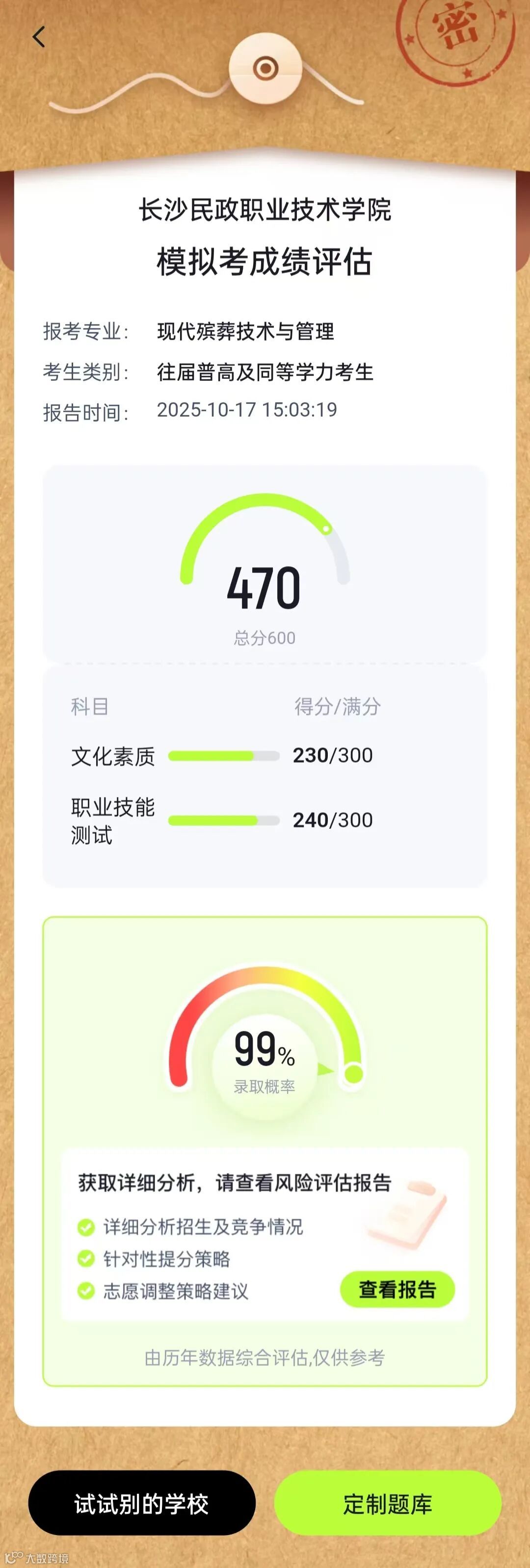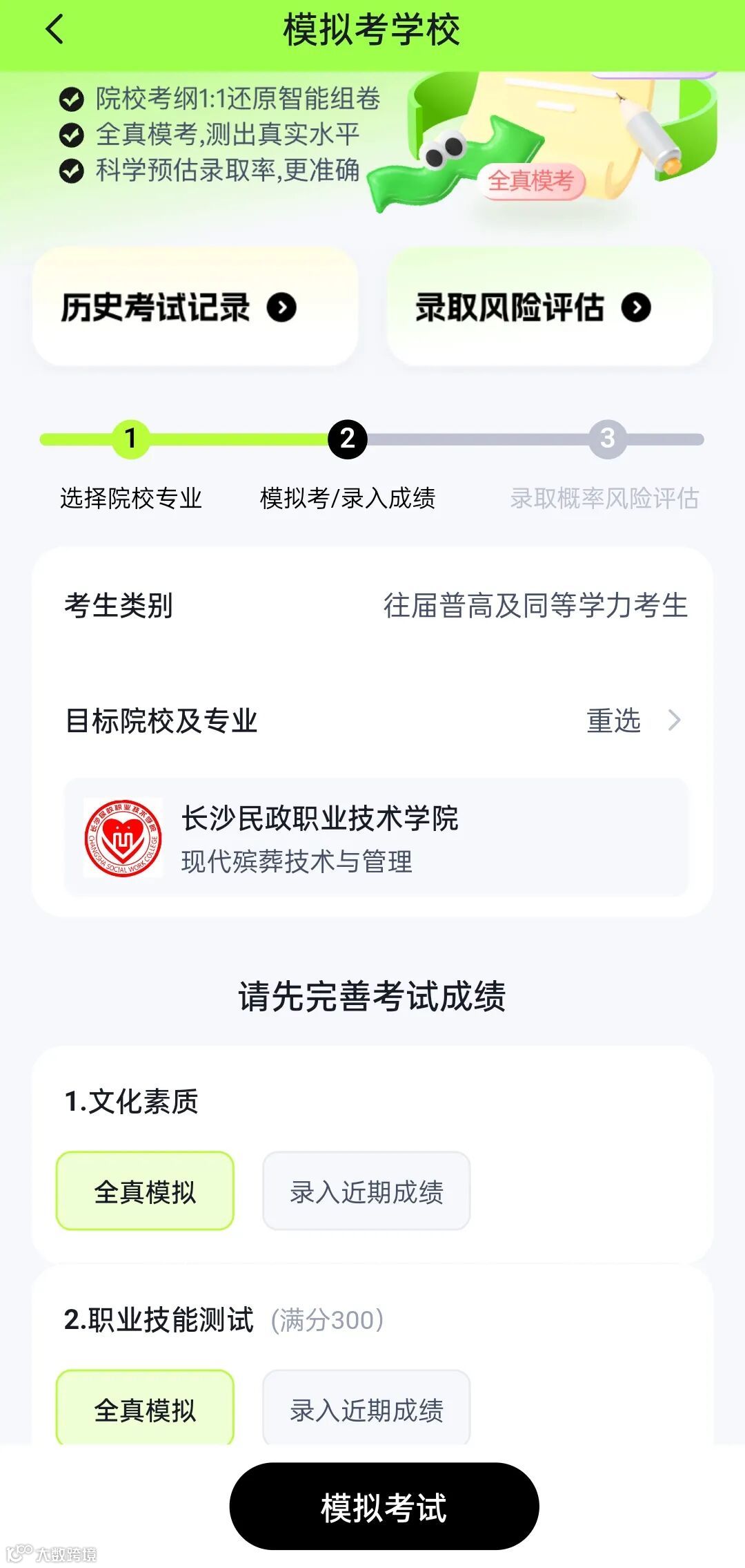 操作超简单:打开 App,选择 “长沙民政职业技术学院”,输入你的考生类型(普高 / 中职 / 社会考生)、模考文化分、技能测试预估分;