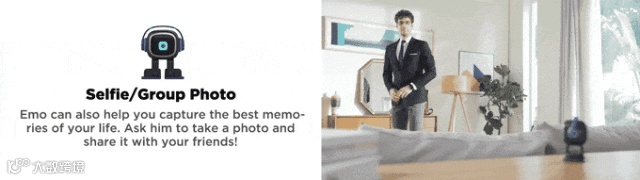 3. 拍照功能: EMO 还具备拍照功能,能够帮助用户记录生活中的美好瞬间。无论是自拍还是集体照,用户只需下达拍照指令,它就会迅速调整角度,完成拍摄。这一功能为用户的生活增添了更多乐趣,让用户能够随时捕捉有趣的场景和欢乐的时刻,并方便地与朋友分享。 -