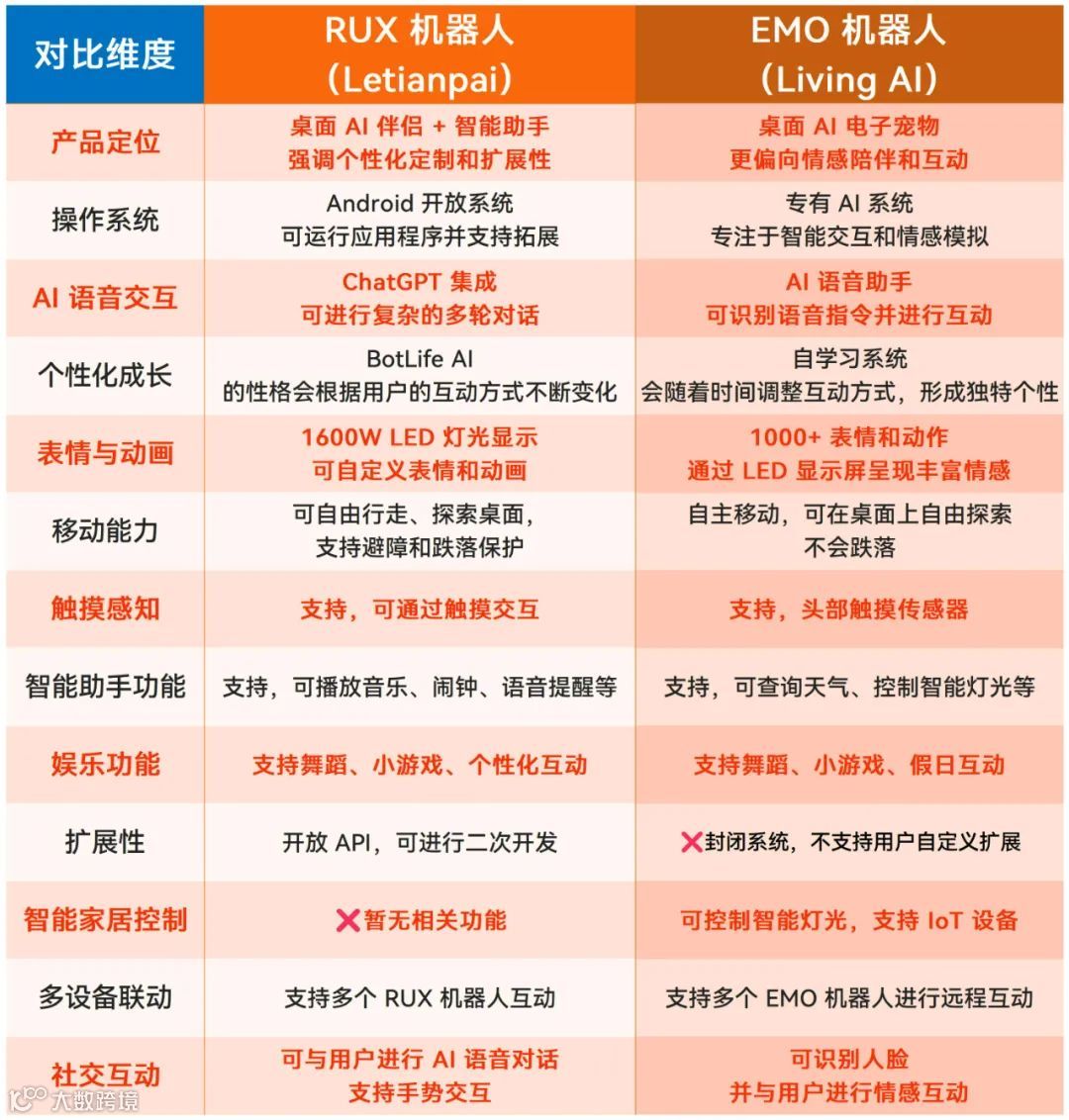 接下来,让我们一同深入剖析 EMO,并将其与乐天派 RUX 机器人进行多维度对比。