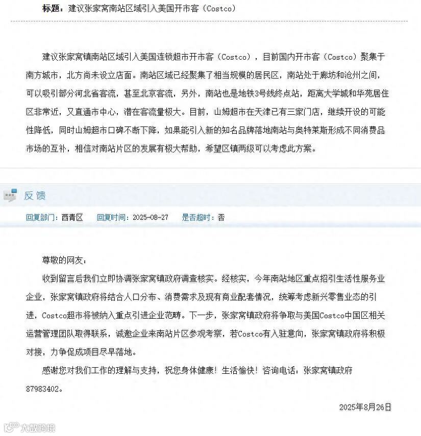 官方回复:经核实,今年南站地区重点招引生活性服务业企业,张家窝镇政府将结合人口分布、消费需求及现有商业配套情况,统筹考虑新兴零售业态的引进,Costco超市将被纳入重点引进企业范畴。下一步,张家窝镇政府将争取与美国Costco中国区相关运营管理团队取得联系,诚邀企业来南站片区参观考察,若Costco有入驻意向,张家窝镇政府将积极对接,力争促成项目尽早落地。